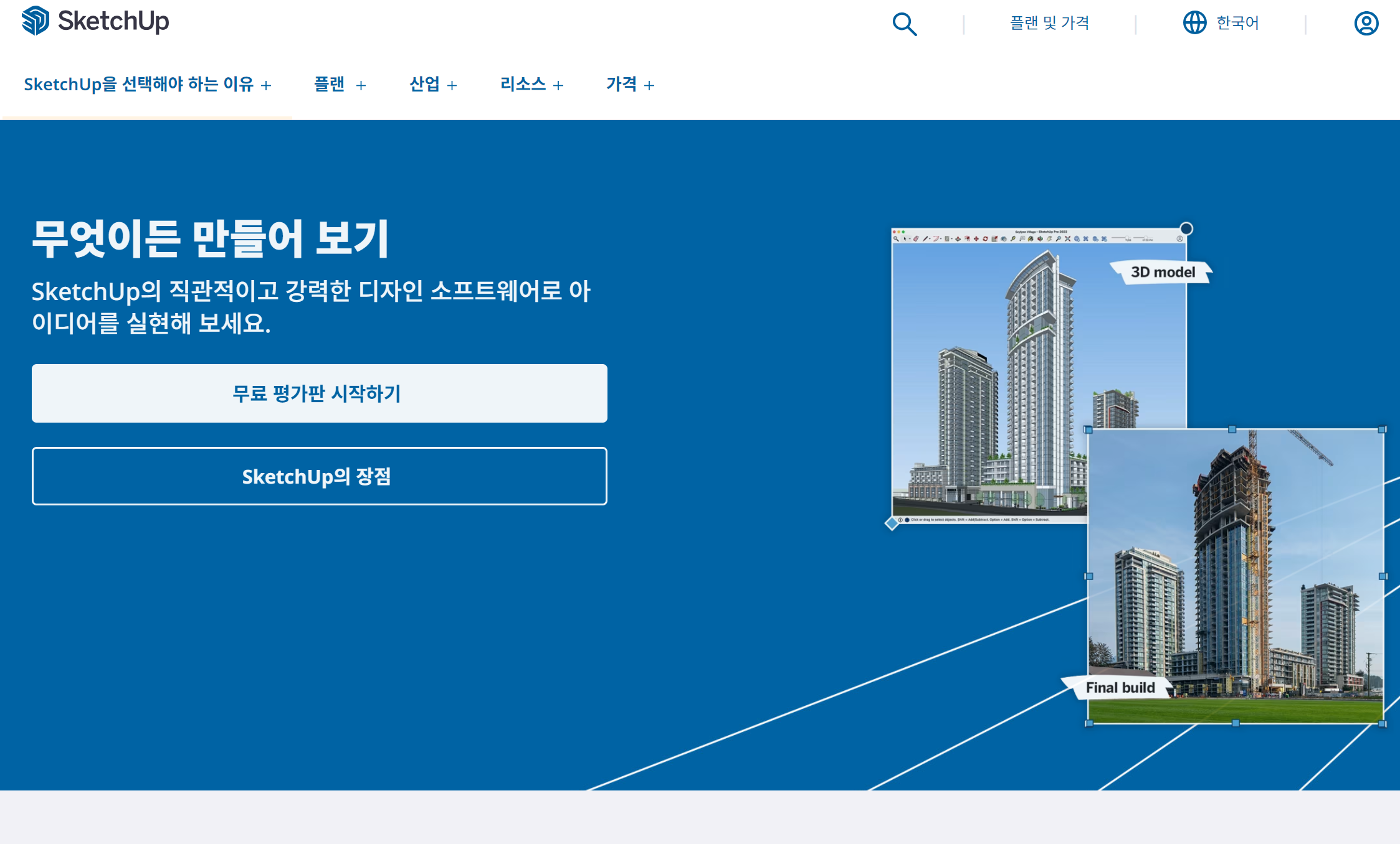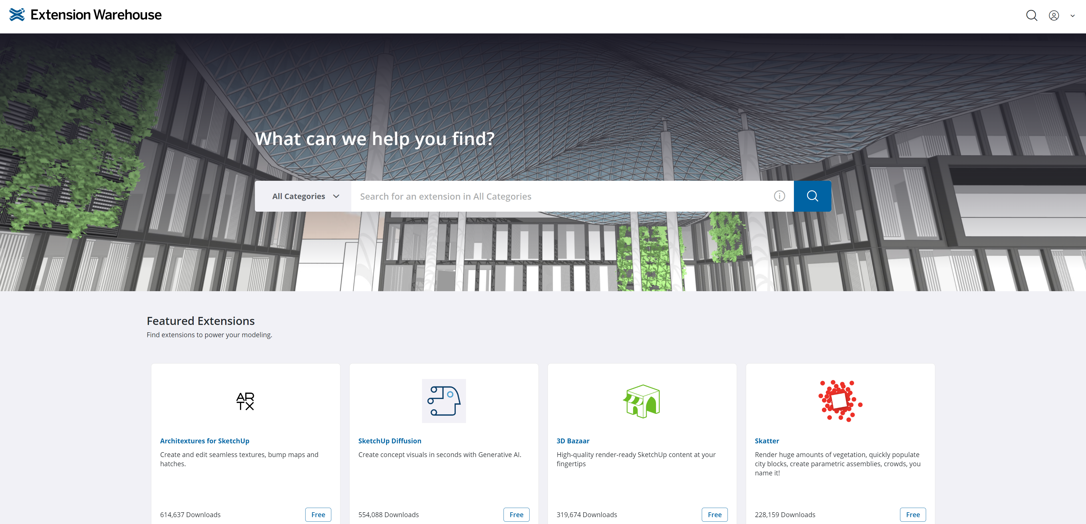 스케치업 공식 사이트에서 제공하는 확장 프로그램 다운로드 사이트로, 수많은 플러그인을 쉽게 찾고 설치할 수 있습니다. 스케치업 프로그램 내에서 바로 접근할 수 있는 Extension Warehouse에서 원하는 플러그인을 검색하고 설치하세요.